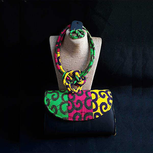 Beautifully handcrafted Multicoloured Clutch Set. Includes a clutch bag, necklace and a set of earrings. This set has been designed out of high-quality African fabric and will provide a perfect finish to a beautiful dress.